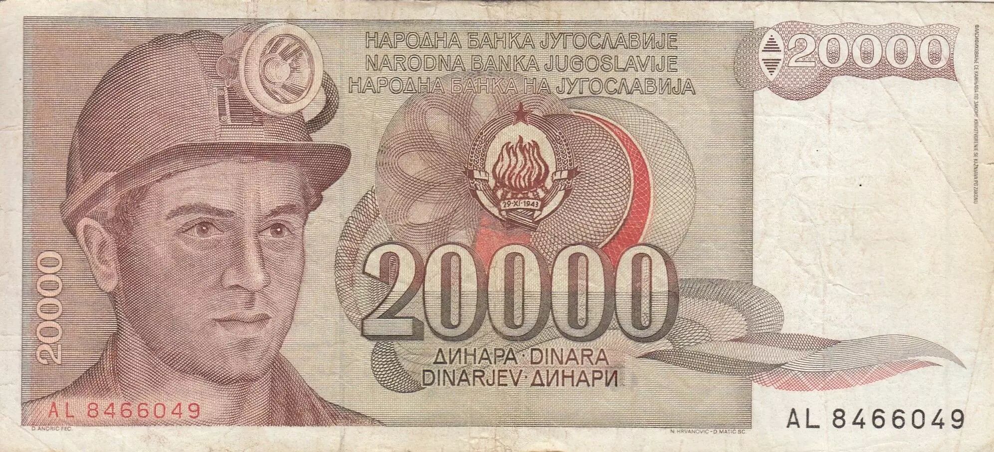 This 1987 20,000 dinara banknote is a testament to the economic and political history of Yugoslavia in the late 1980s. It reflects the symbols and values of that period, as well as the importance of sectors such as the mining industry in the national identity.