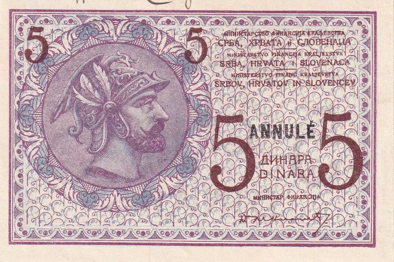 Banknote Yugoslavia 5 Dinars - Helmeted man - Specimen annulé - ND (1919) - P.16s