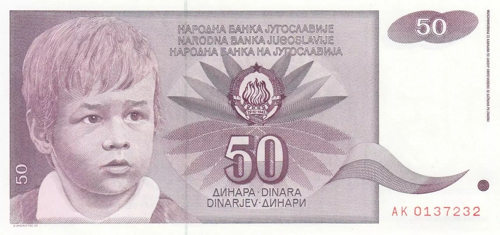 The watermark of the banknote depicts the portrait of a schoolboy, reproducing the main motif of the obverse. The issuing institution and the series to which this banknote belongs are not specified in the data provided. The nominal value of the banknote is 50 dinars.
