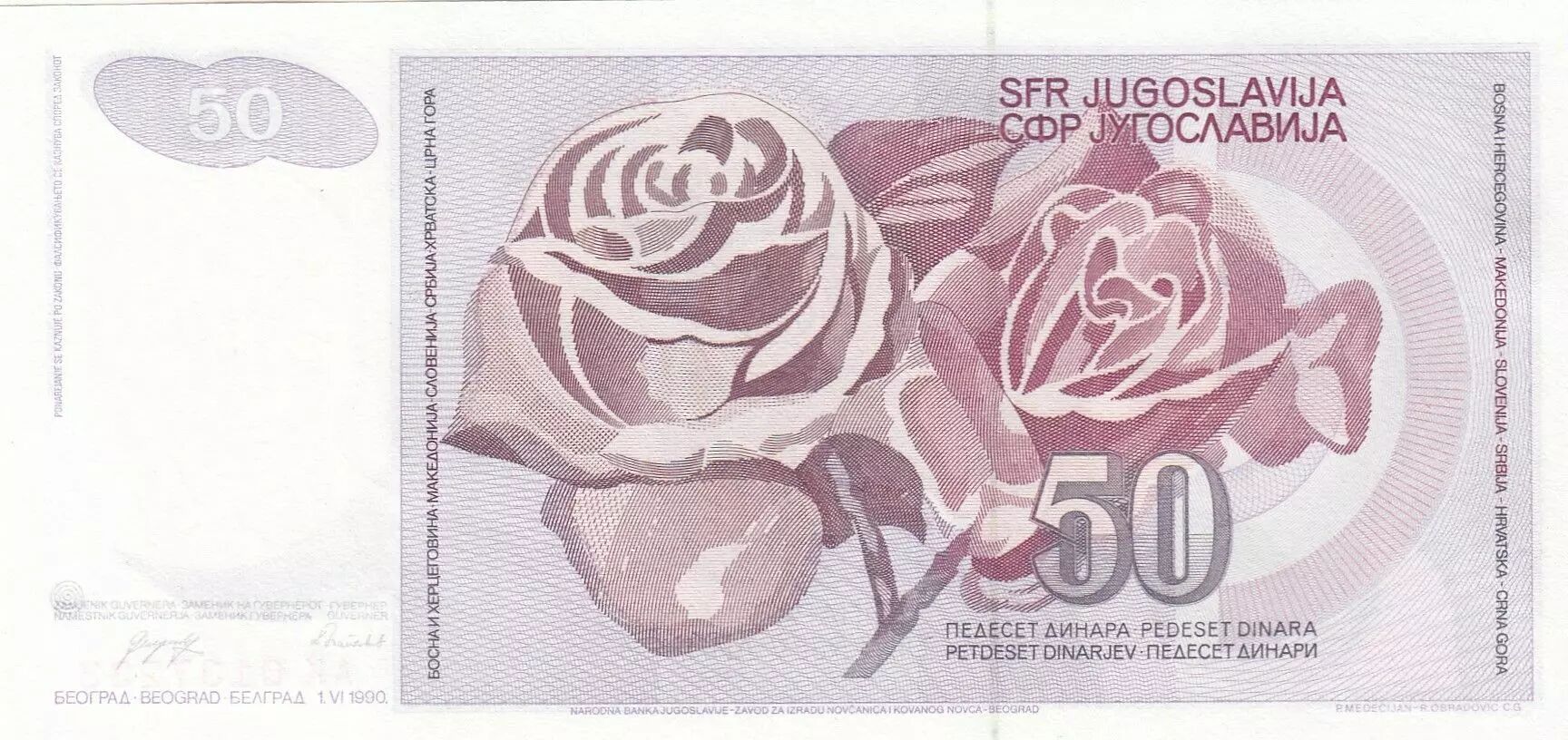 The reverse of the banknote features roses positioned in the center right. The inscriptions are also in Cyrillic and Latin. The names "P. MEDECIJAN - R. OBRADOVIC C.G." refer to the engravers Petar Medecijan and Radovan Obradovic. Dragisa Andric is also credited as the designer of the reverse.