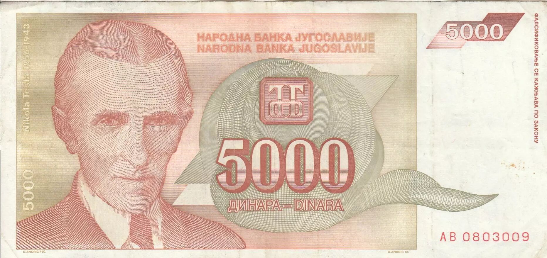 This 5000 dinara banknote is a testament to the turbulent economic period that Yugoslavia went through in the 1990s. It also serves as a memorial to Nikola Tesla, honoring his contribution to science and technology. The choice of Tesla as the central figure of the banknote underscores the importance given to innovation and progress in a context of economic and political crisis.