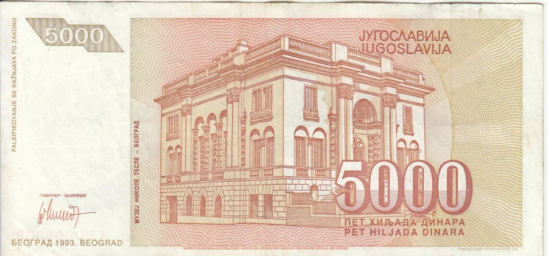 The 5000 Yugoslav dinara banknote, issued in 1993, represents a denomination from the series of dinars issued during the period of hyperinflation in Yugoslavia. This banknote is part of the National Bank of Yugoslavia's efforts to manage the economic instability of that period.