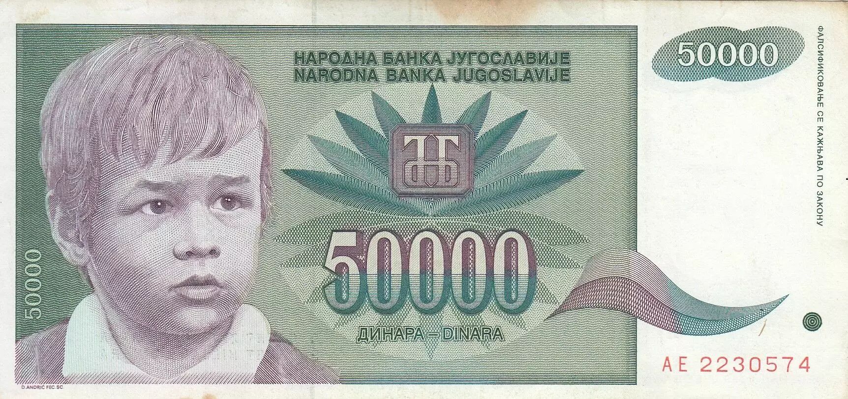This banknote was issued by Yugoslavia in 1992. It has a face value of 50,000 dinars. The main motif of this banknote is a child and a flower.