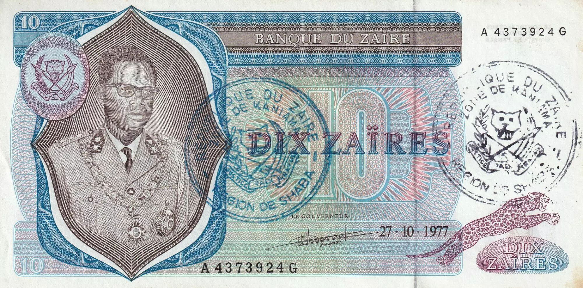 Accueil > Archivage > Zaïre 10 Zaire - Pdt Mobutu - Léopard - 1977 - Kaniama - P.R4b