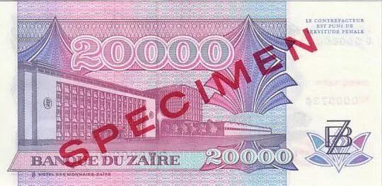 Home > World Banknotes > African Banknotes > Zaire > Zaire 20000 Zaire Pdt Mobutu, leopard - Bank of Zaïre - 1991