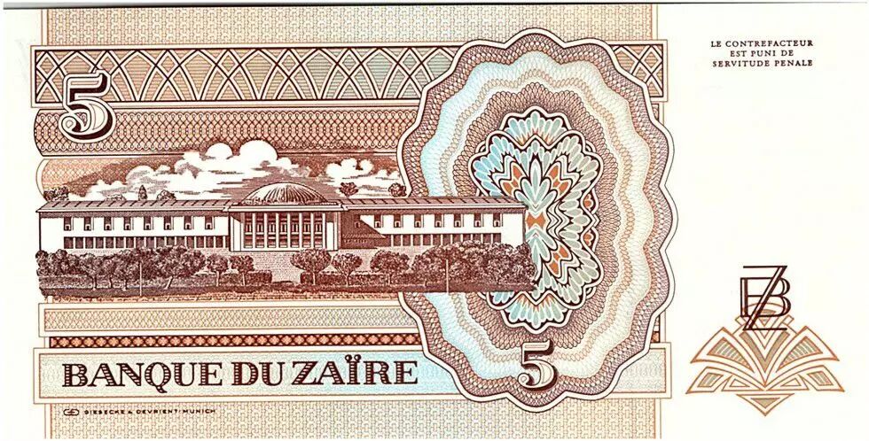 Billet Zaïre 5 Nvx Zaires 1993 - Pdt Mobutu, Bâtiment du Domed