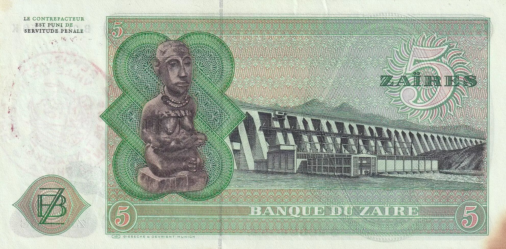Banknote Zaire 5 Zaire - Pdt Mobutu - Hydroelectric dam - 1977 - Kalemie - P.R3c
