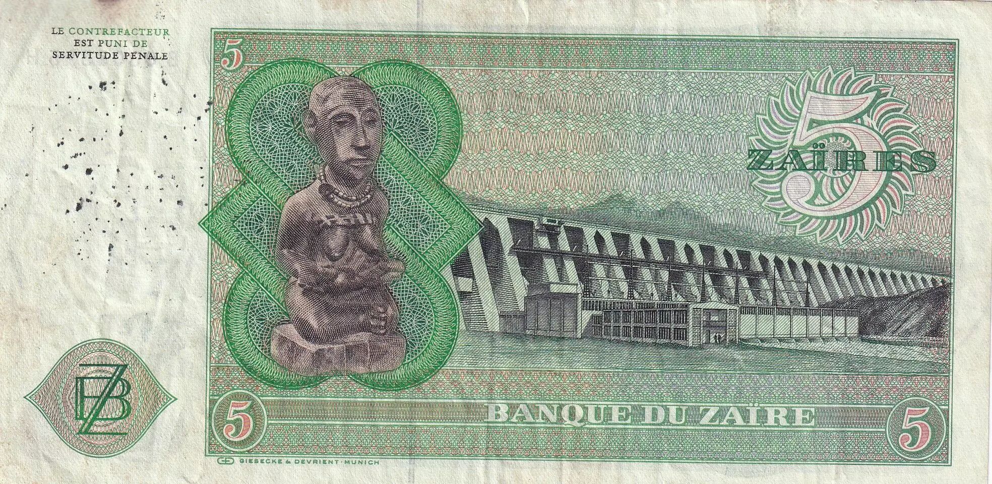 Banknote Zaire 5 Zaire - Pdt Mobutu - Hydroelectric dam - 1977 - Kaniama - P.R3c