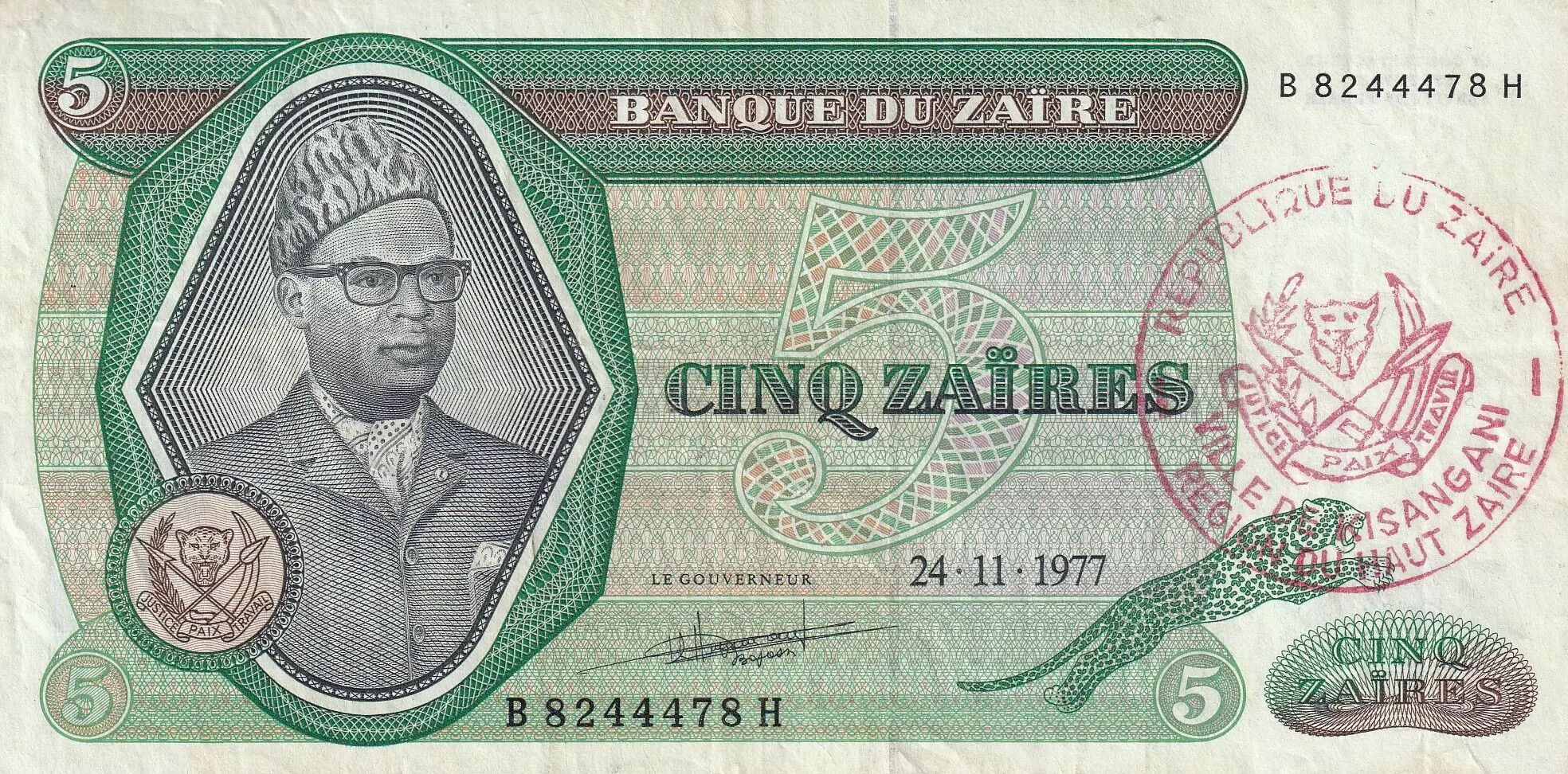 Banknote Zaire 5 Zaire - Pdt Mobutu - Hydroelectric dam - 1977 - Kisangani - P.R3c