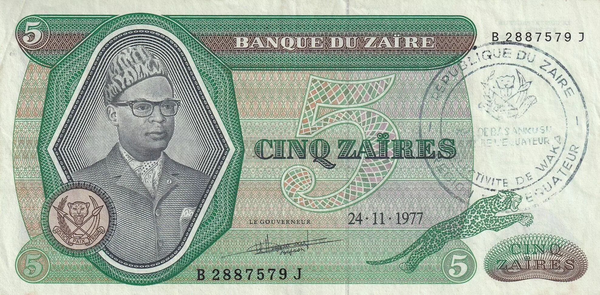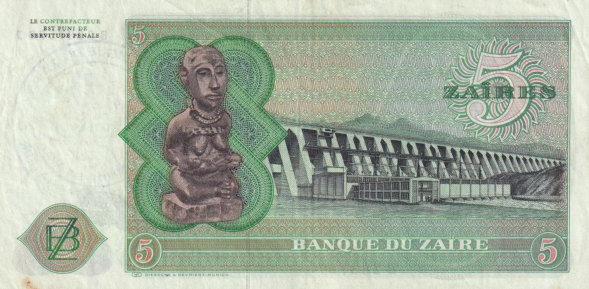 Banknote Zaire 5 Zaire - Pdt Mobutu - Hydroelectric dam - 1977 - Waka - P.R3c