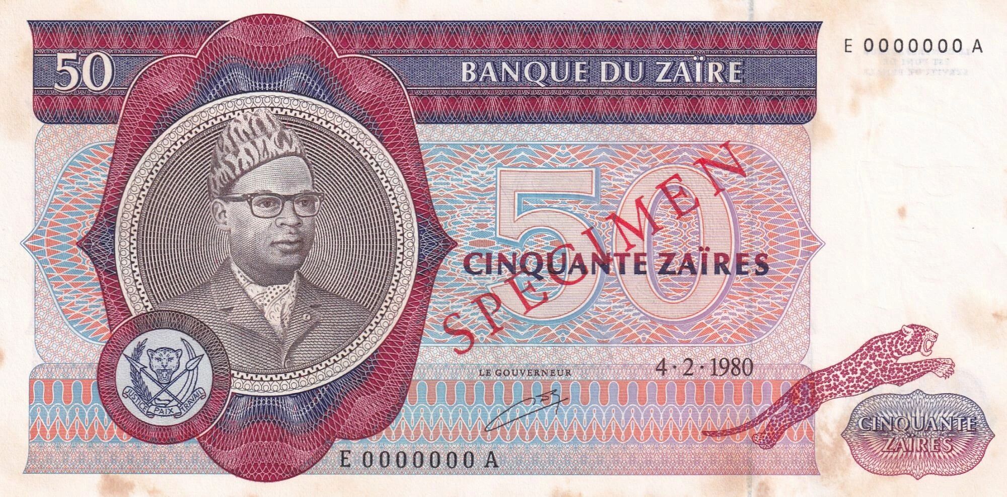 Le billet de 50 zaïres émis en 1980 par la Banque du Zaïre constitue un témoignage de l'histoire monétaire de ce pays. Ce billet appartient à la série E-A.