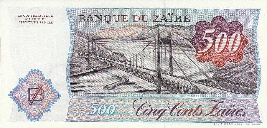 Banknote Zaire 500 Zaires 1985 - President Sese Seko Mobutu, Bridge