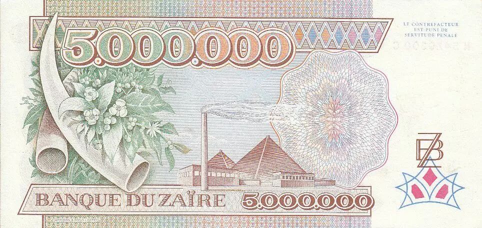 Accueil > Billets du Monde > Billets d'Afrique > Zaïre > Zaïre 5000000 Zaires 1992 - Président Sese Seko Mobutu, usine