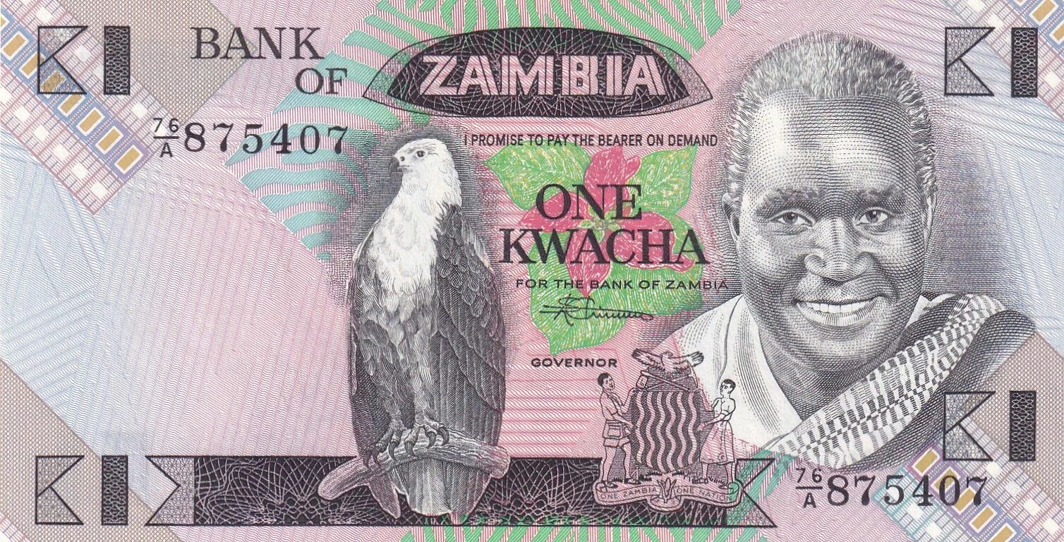 This Zambian banknote has a face value of 1 kwacha. It belongs to the A/76 series and was issued between 1980 and 1988.