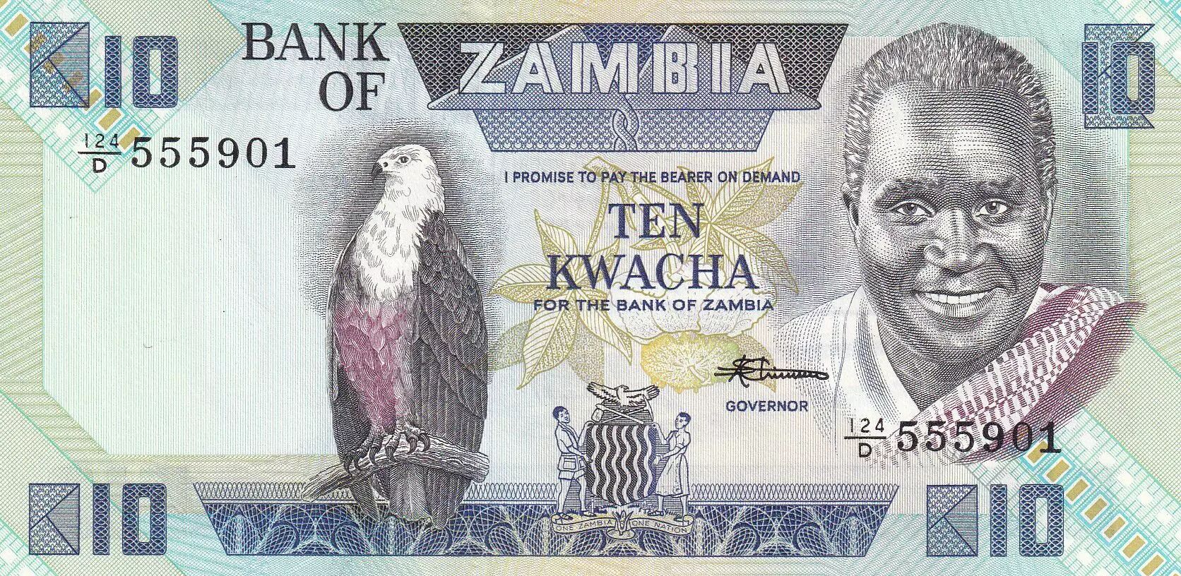Home > World Banknotes > African Banknotes > Zambia > Zambia 10 Kwacha - Pres K. Kaunda - Banque - ND (1986-1988) - Serial D.124 - P.26e