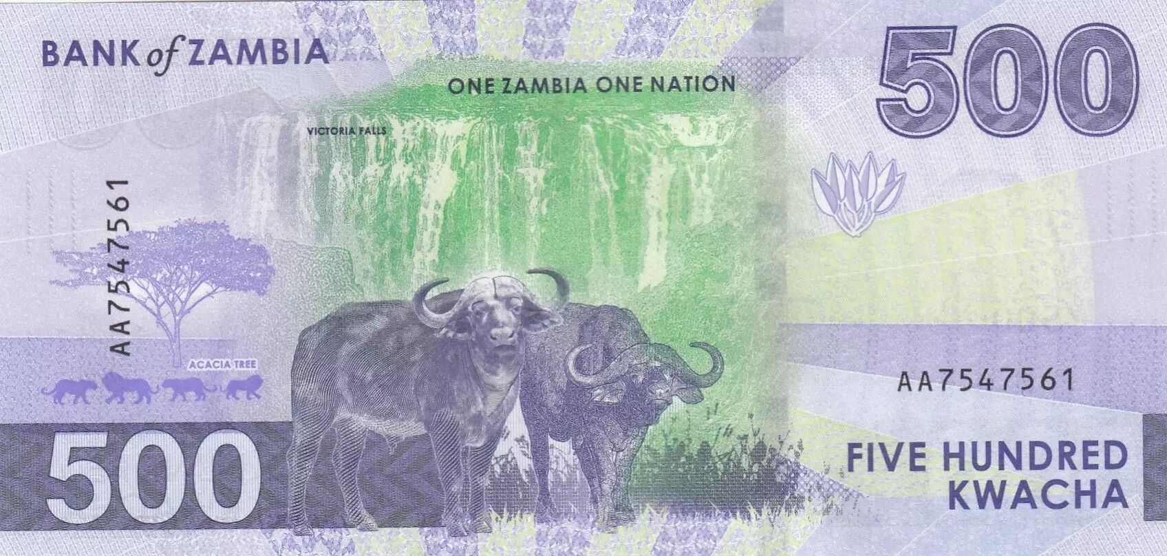 The 500 kwacha banknote issued by the Bank of Zambia in 2024 is part of the AA Series. This banknote has dimensions of 124 mm in length and 69 mm in width.