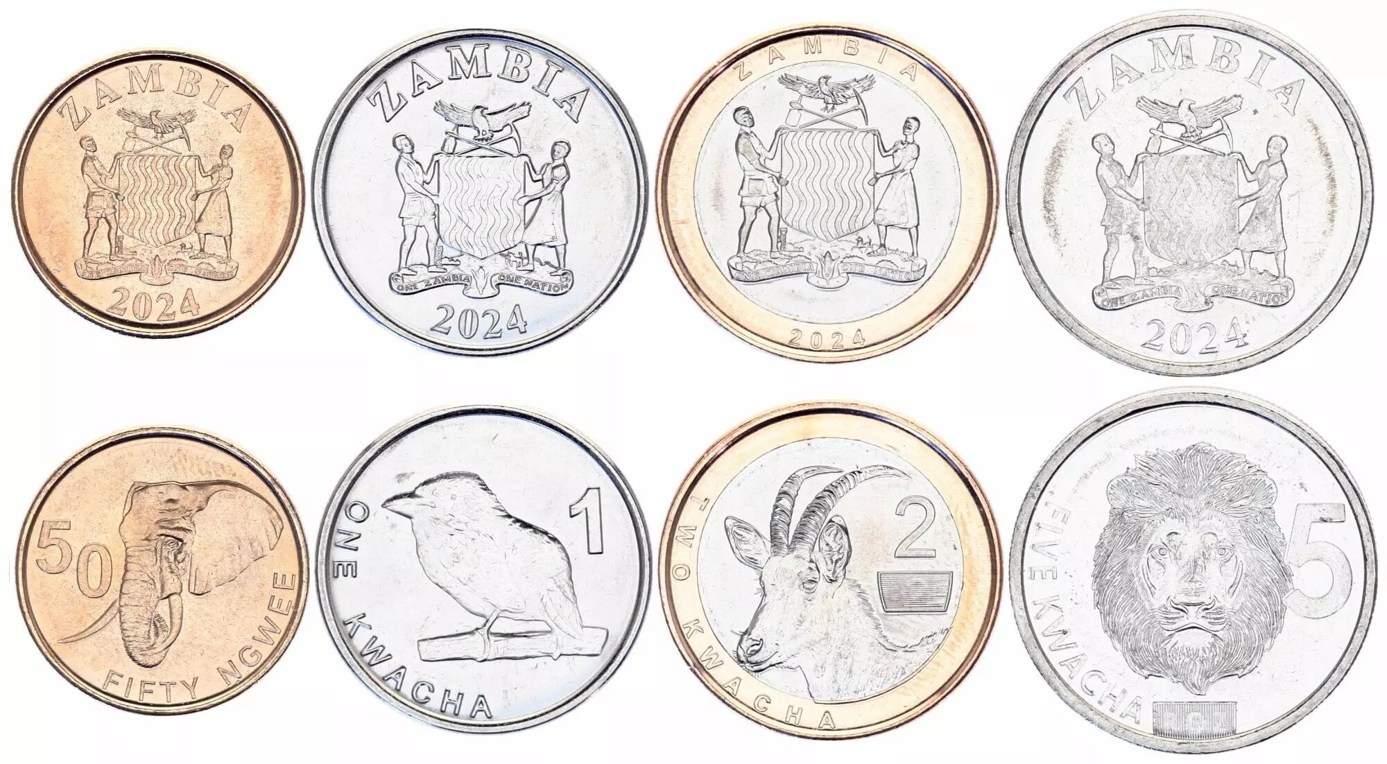 This numismatic set includes four coins issued by Zambia in 2024. Each coin features distinct characteristics in terms of face value, designs, and composition.