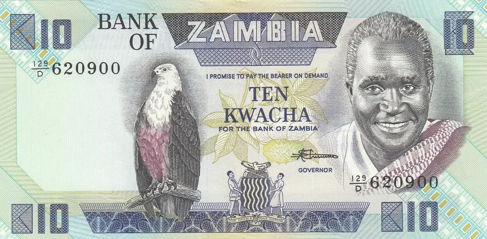 Au recto, le billet arbore un aigle, symbole national, ainsi que les armoiries de la Zambie. Le portrait du président Kenneth Kaunda, figure politique centrale du pays, est positionné sur la droite. Les inscriptions sont en latin, avec la mention "BANK OF ZAMBIA" en haut. Une promesse de paiement au porteur de dix kwacha est également inscrite, engageant la Banque de Zambie. La série de ce billet est identifiée par la lettre D et le numéro 129, référencé comme P.26e dans les catalogues numismatiques.