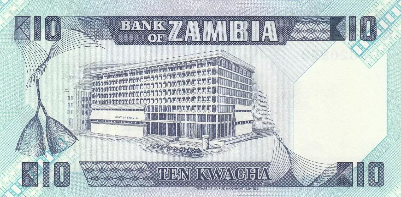 Le verso du billet met en scène le bâtiment de la Banque de Zambie, situé au centre gauche. Comme au recto, les inscriptions sont en latin, avec la mention répétée "BANK OF ZAMBIA" et la valeur nominale "TEN KWACHA".