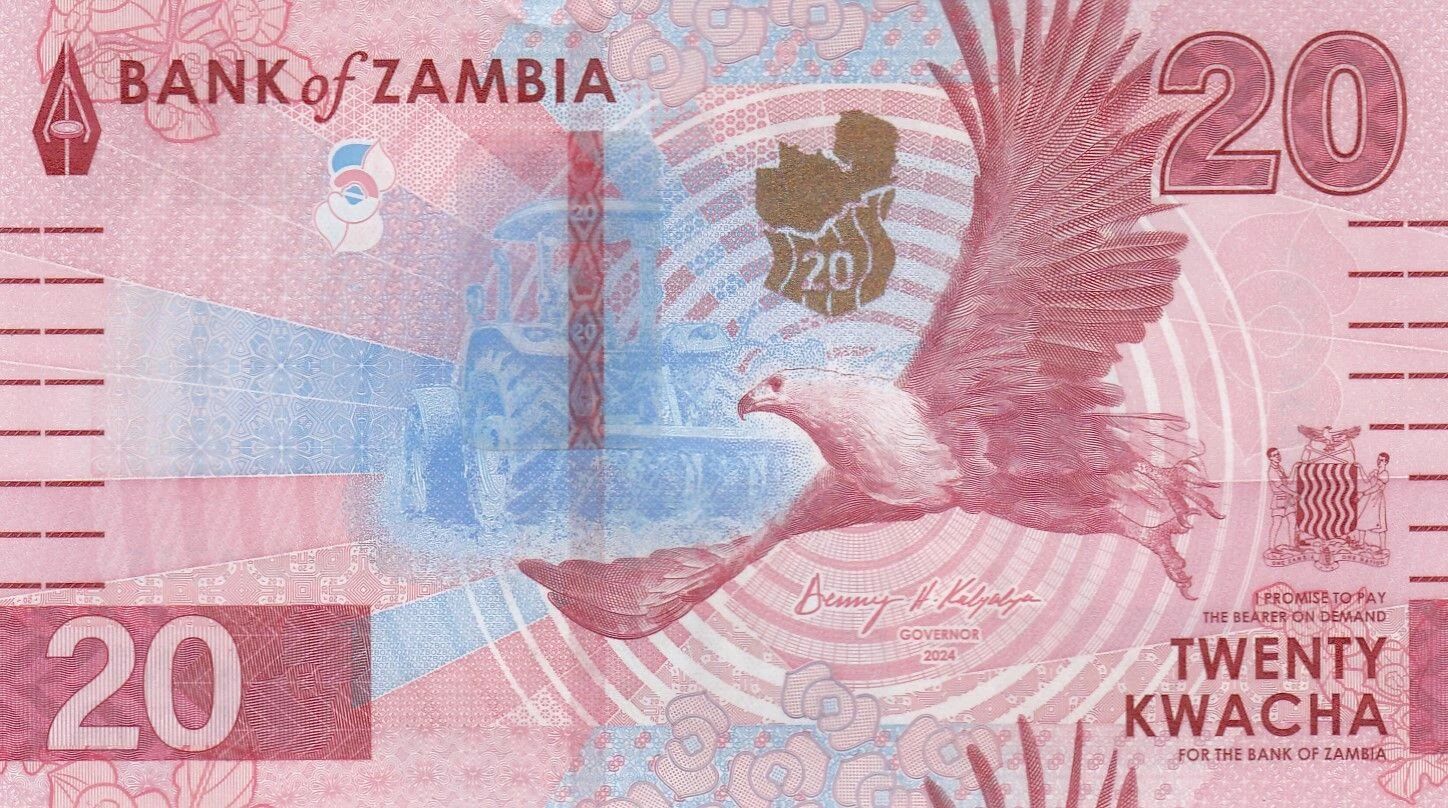 Le billet de 20 kwacha émis par la Banque de Zambie en 2024 présente une conception complexe et des éléments de sécurité avancés. Il mesure 124 mm de long et 69 mm de large. Le recto du billet est principalement imprimé en nuances de violet et de bleu, avec des inscriptions en anglais.