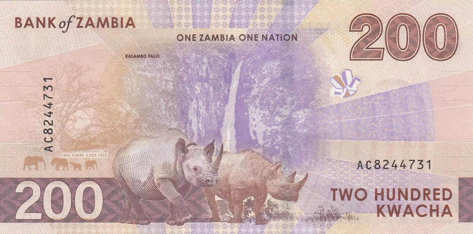 Le billet de 200 kwacha de Zambie, émis en 2024, présente une dominante de couleurs mauve et bleue sur son recto. Les inscriptions sont rédigées en anglais. On y retrouve le logo de la Banque de Zambie, ainsi qu'un motif floral servant de dispositif d'enregistrement. Une scène illustrant un tracteur labourant un champ est également présente, de même qu'un aigle pêcheur en plein vol et une carte de la Zambie réalisée en encre OVI (Optical Variable Ink). Les armoiries de la Zambie y figurent aussi.