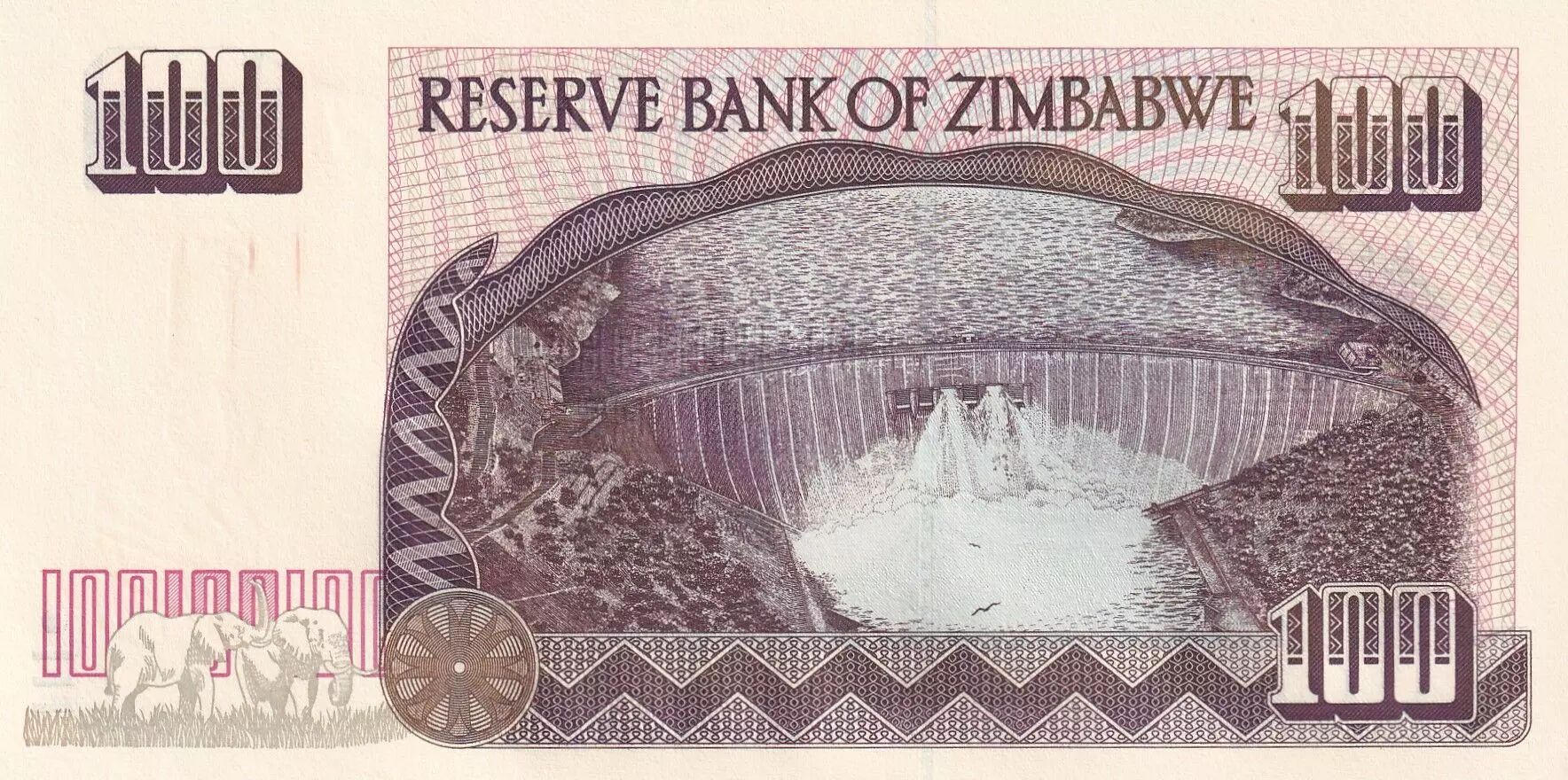 Home > World Banknotes > African Banknotes > Zimbabwe > Zimbabwe 100 Dollars - Chiremba, dam - 1995