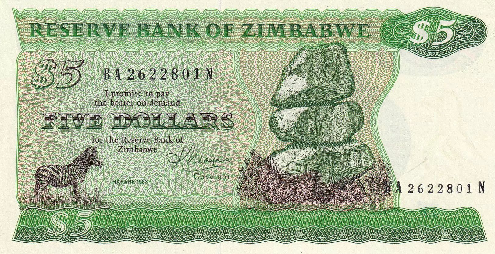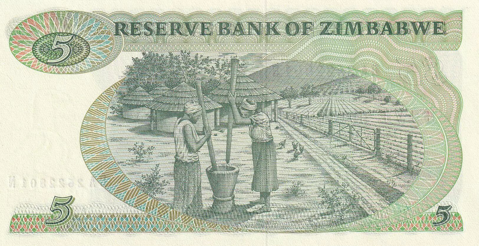 Billet Zimbabwe 5 Dollars - Chiremba, zèbre - Scène de village - 1983 - NEUF - P.2c