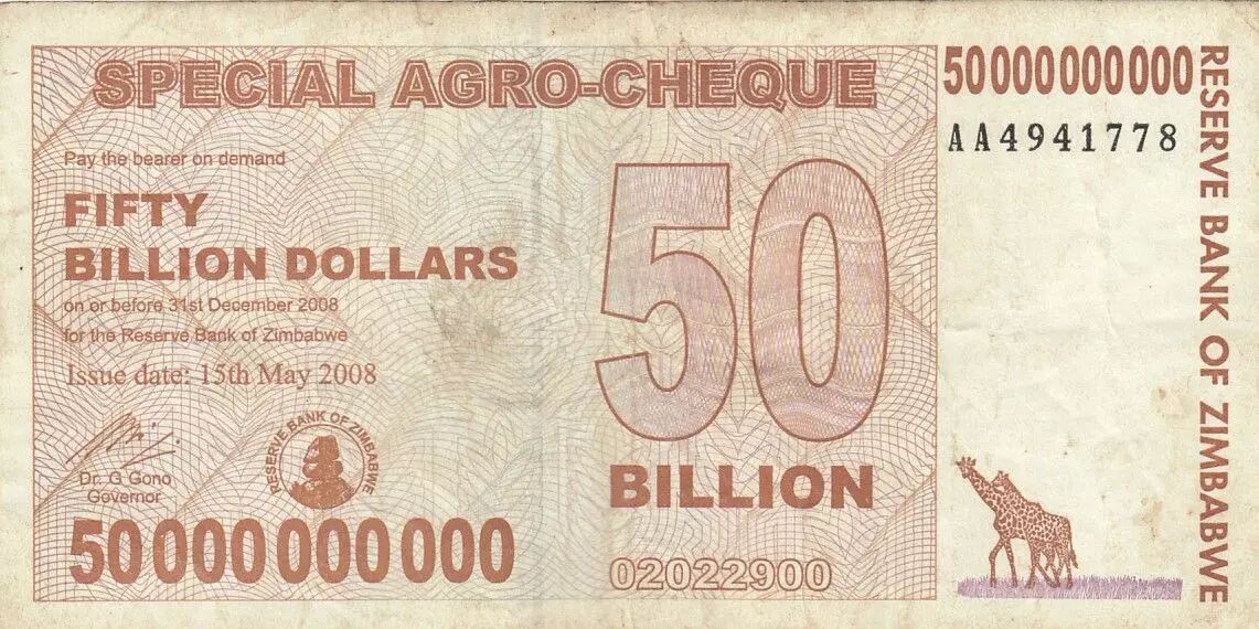 Banknote Zimbabwe 50 000 000 000 Dollars - Agro-cheque - Giraffes - 2008 - P.63