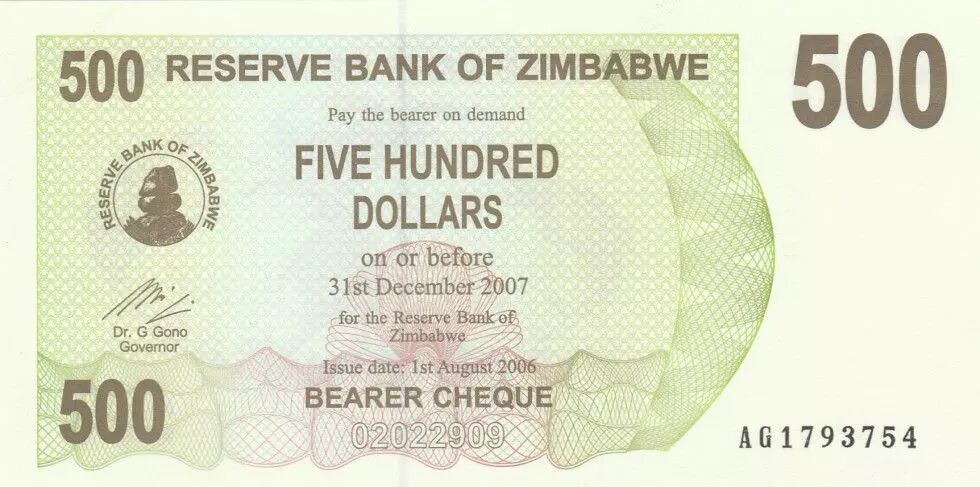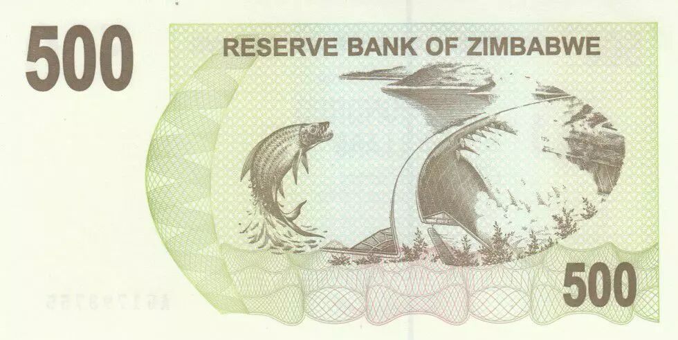 Banknote Zimbabwe 500 Dollar Dam, tigerfish - 2006